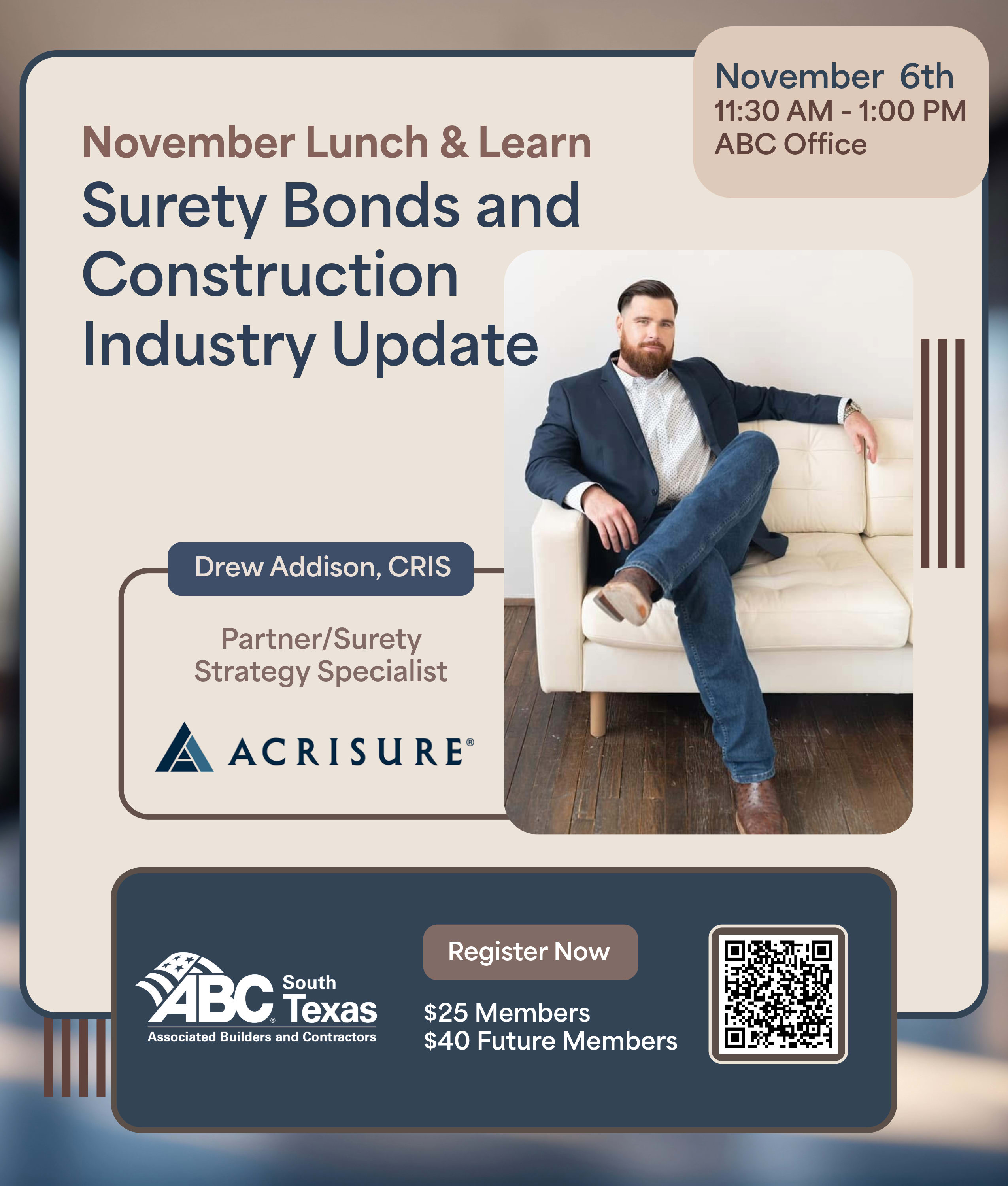 Come hear from Drew Addison, Partner with Acrisure, as he speaks on Surety Bonds and gives an industry outlook